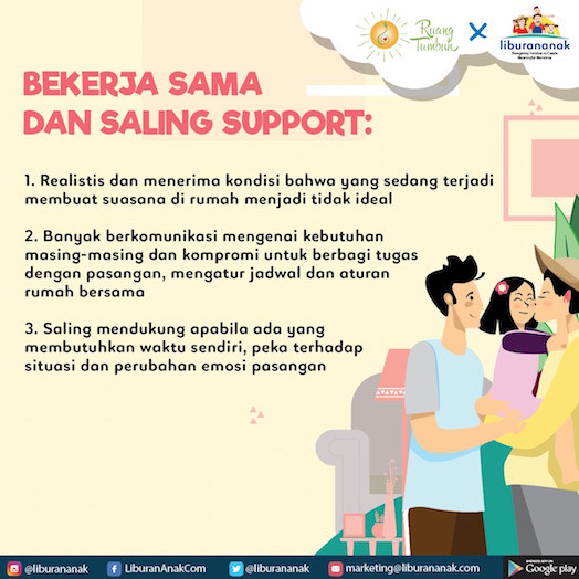 - Saling mendukung apabila ada yang membutuhkan waktu sendiri, peka terhadap situasi dan perubahan emosi pasangan