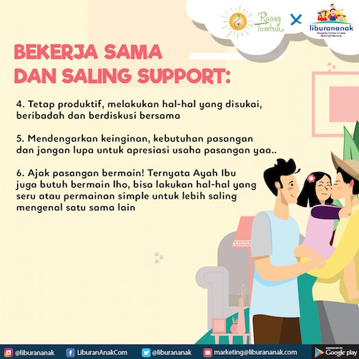 - Ajak pasangan bermain! Ternyata Ayah Ibu juga butuh bermain lho, bisa lakukan hal-hal yang seru atau permainan simple untuk lebih saling mengenal satu sama lain.
