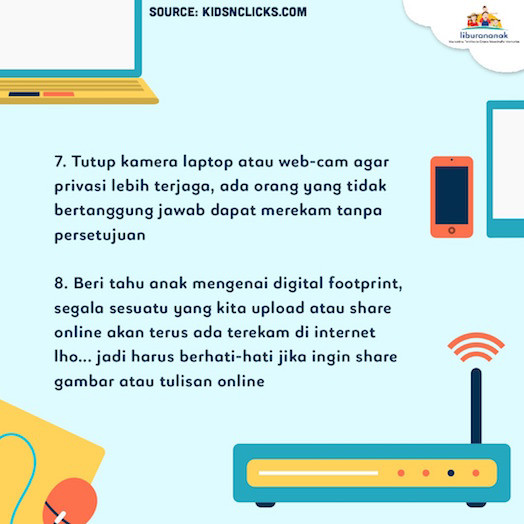 8. Beri tahu anak mengenai digital footprint, segala sesuatu yang kita upload atau share online akan terus ada terekam di internet lho… jadi harus berhati-hati jika ingin share gambar atau tulisan online