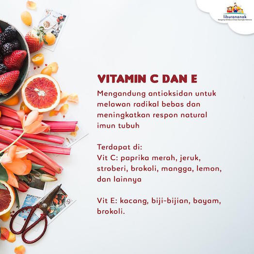 Vit C: paprika merah, jeruk, stroberi, brokoli, mangga, lemon, dan lainnya