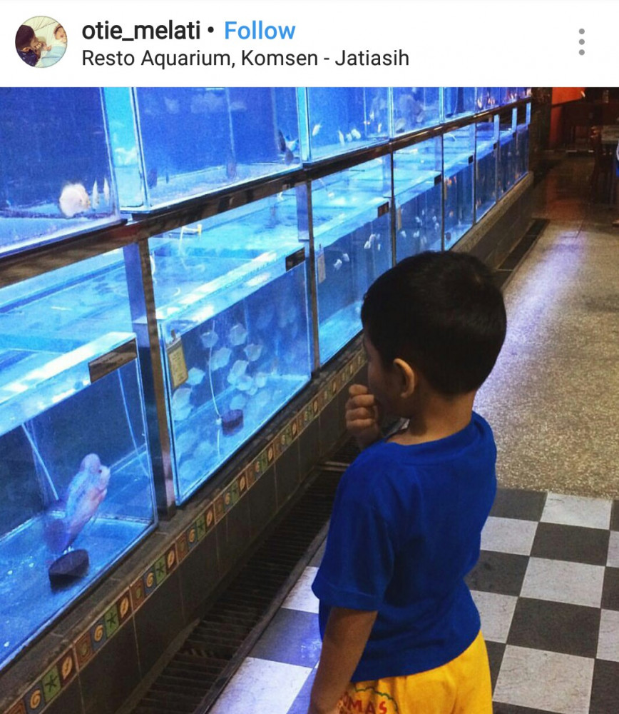 Restoran luas dengan sirkulasi udara terbuka. Deretan akuarium, arena permainan, panggung musik, penataan meja-kursi, dan desain interior restoran amat pas, nyaman, dan resik.