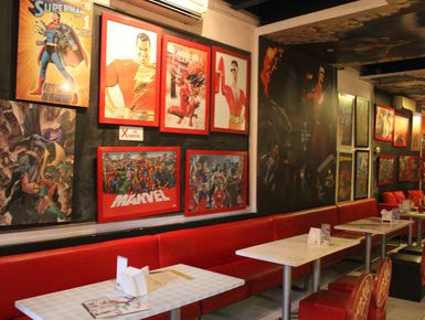 Desain interior Comic Café ini sangat menarik untuk dinikmati bersama anak-anak tercinta. Mulai dari meja-mejan yang dilukis dengan tahap pembuatan sketsa tokoh komik, sampai aksi figure & poster-poster cupilkan film seperti Thor, Wonder Women, Batman, Superman, Spiderman, dan lainnya tergantung di atas langit-langit café.