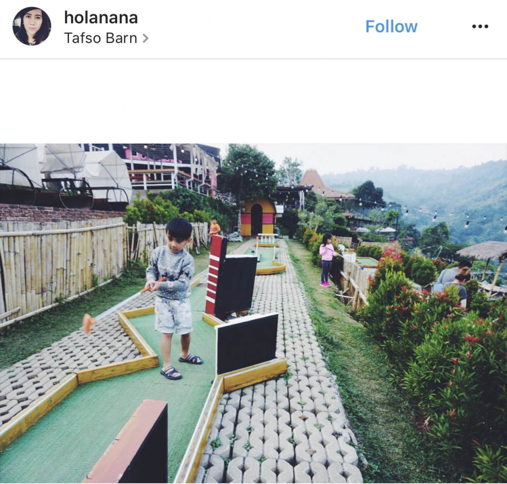 Turun satu undakan lagi, Wargi Bandung bisa menikmati kursi-kursi kayu tanpa atap. Di bawahnya, ada mini golf yang menjadi salah satu fasilitas di Tafso Barn ini. Turun lagi satu undakan, ada “sangkar burung” cantik berwarna putih yang bisa ditempati oleh Wargi Bandung, “sangkar burung” ukuran super besar ini dilengkapi meja, kursi untuk sekitar 4-5 orang.