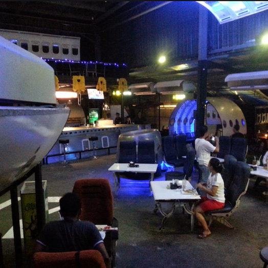 Begitu sampai kita akan melihat hidung pesawat di dekat pintu masuknya. Di dalam, nuansa pesawat itu akan makin terasa, seperti masuk ke hanggar pesawat. Kode mata angin penerbangan, baling-baling, dan kursi-kursi penumpang menjadi bagian dari interior. Duduk di kursi-kursi itu, terasa seperti sedang di kabin pesawat. Bisa juga jika kita ingin merasakan kursi pilot di cockpit pesawat. Waitress-nya pun berseragam layaknya awak pesawat.