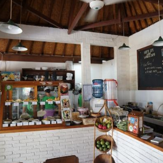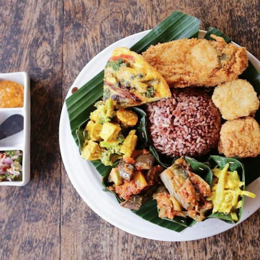 Warung Sopa serves good vegetarian nasi campur from a cabinet for 8000 IDR per item. You can choose from curries like tofu, banana leaf, eggplant, and lentil, as well as samosas, spring rolls, and fried tempeh, all served with red rice. They also have lots of soups and a few other dishes on their menu.