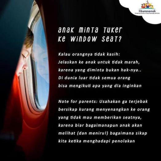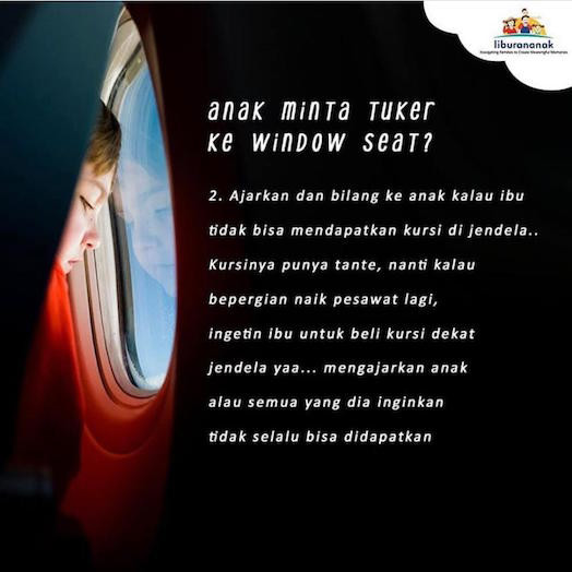 Ajarkan dan bilang ke anak kalau ibu tidak bisa mendapatkan kursi di jendela.. kursinya punya tante, nanti kalau bepergian naik pesawat lagi, ingetin ibu untuk beli kursi dekat jendela yaa… mengajarkan anak kalau semua yang dia inginkan tidak selalu bisa didapatkan