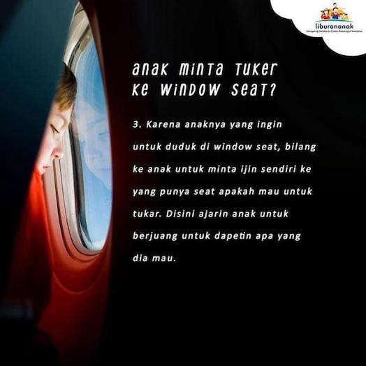 Karena anaknya yang ingin untuk duduk di window seat, bilang ke anak untuk minta ijin sendiri ke yang punya seat apakah mau untuk tukar. Disini ajarin anak untuk berjuang untuk dapetin apa yang dia mau.