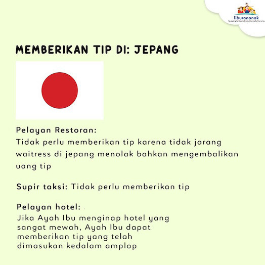 Ayah Ibu tidak perlu memberikan tip karena tidak diharapkan, tapi Ayah Ibu dapat memberikan jika mengunjungi restoran mewah