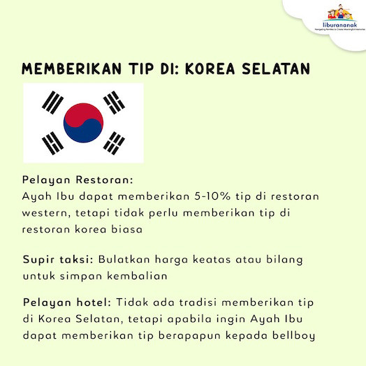 Tidak ada tradisi memberikan tip di Korea Selatan, tetapi apabila ingin Ayah Ibu dapat memberikan tip berapapun kepada bellboy