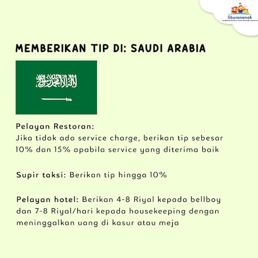 Pelayan hotel : Berikan 4-8 Riyal kepada bellboy dan 7-8 Riyal/hari kepada housekeeping dengan meninggalkan uang di kasur atau meja