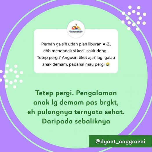 Dilema ortu liburan sama anak. Udah dijaga jauh-jauh hari anak ga boleh kecapean, ga boleh berenang, ga boleh makan aneh-aneh menjelang travelling, ehhhhhh last minute sakit. Demam. Batuk pilek. Lemes. .
